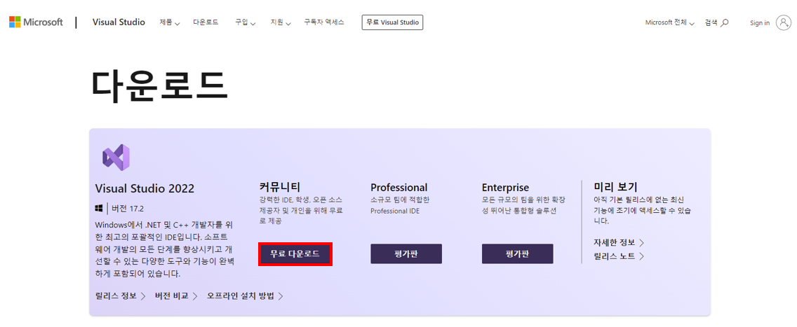 1. https://visualstudio.microsoft.com/ko/downloads/ 접속 후 Visual Studio 2022 커뮤니티 무료 다운로드 버튼 클릭