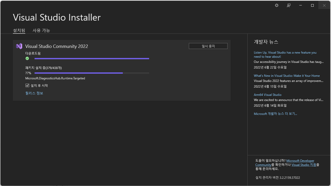 4. 설치가 마무리되면 다음과 같이 비주얼 스튜디오 설치 정보가 나타난다. '시작' 버튼을 누르면 프로그램 시작.