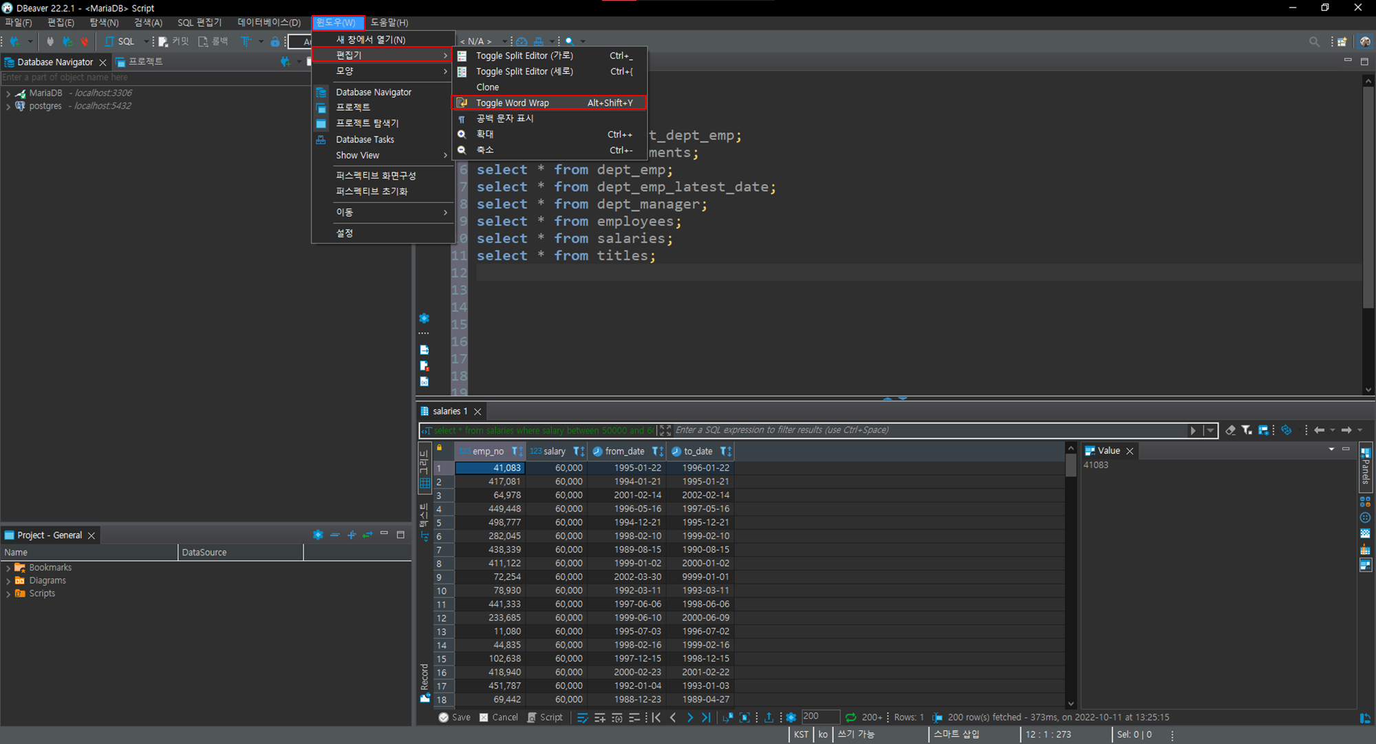 DBeaver는 default값으로 자동 줄바꿈을 하지 않고 옆으로 쭉 이어서 글자를 적어나간다.