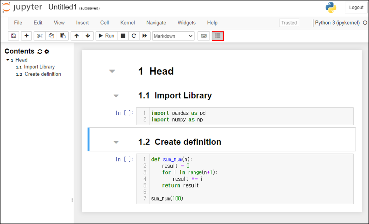 참고자료 : https://jupyter-contrib-nbextensions.readthedocs.io/en/latest/install.html