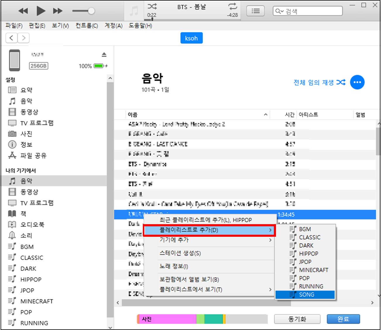 4. 다운받은 곡을 우클릭 후 '플레이리스트로 추가(D)' -> 생성 한 플리에 넣는다.