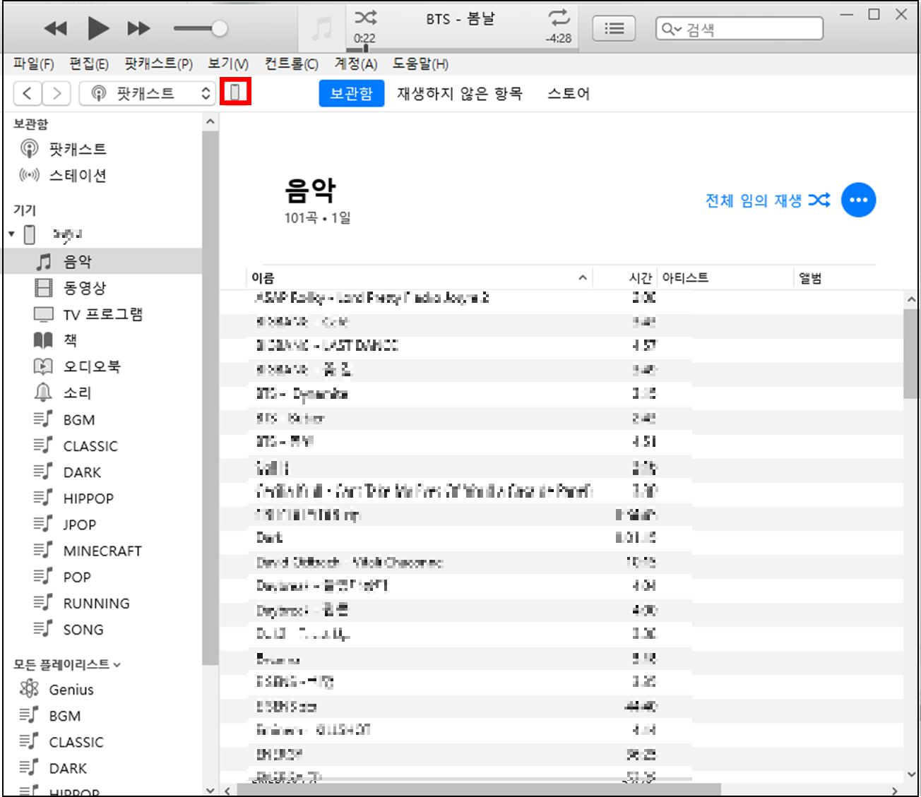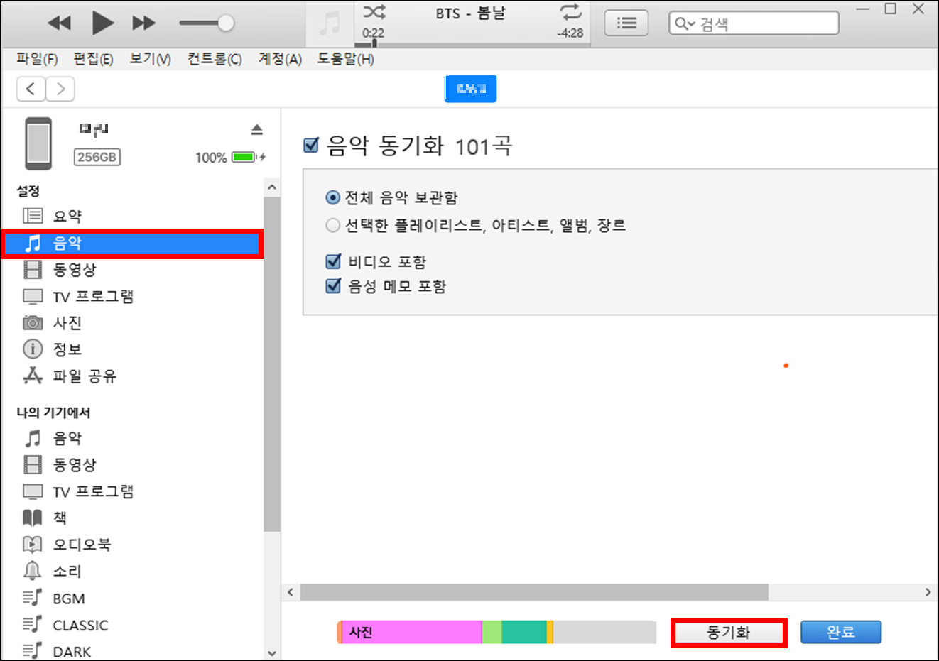 5. 나의 기기로 들어간 다음 '음악'탭 클릭 후 동기화를 수행한다.