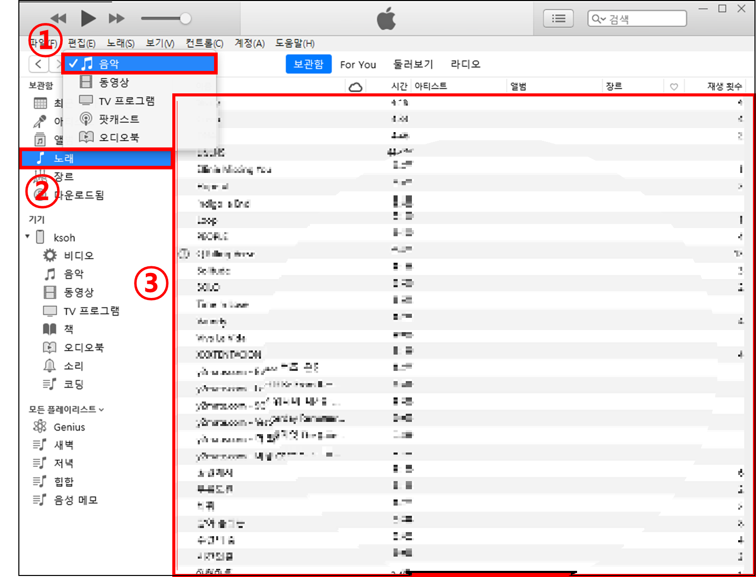 2. '음악' 탭에서 '노래' 선택 후 3번 목록창에 다운받은 음악파일(.mp3)을 드래그해서 넣는다.
