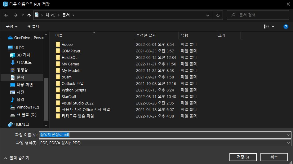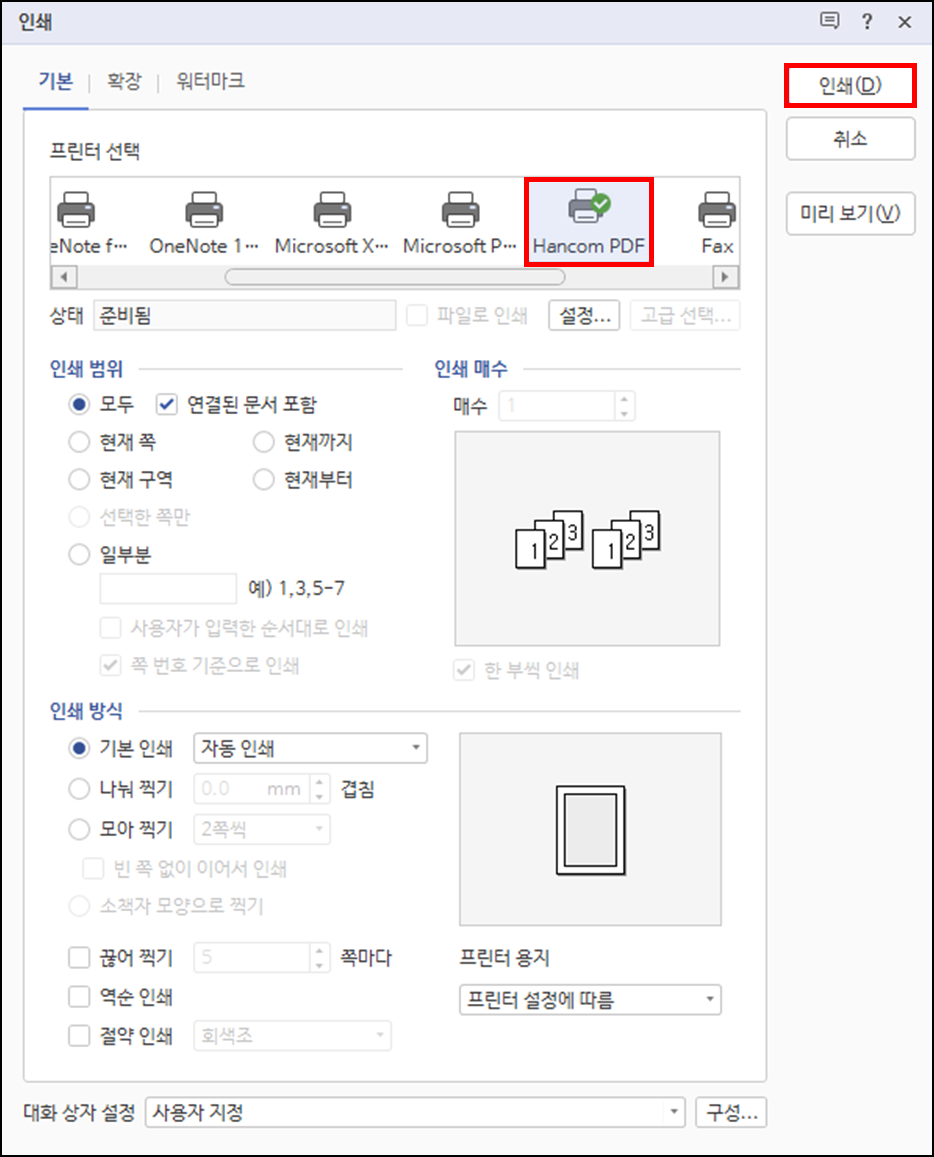 2. 프린터 선택 -> PDF 옵션 선택 -> '인쇄(D)'