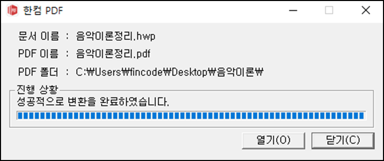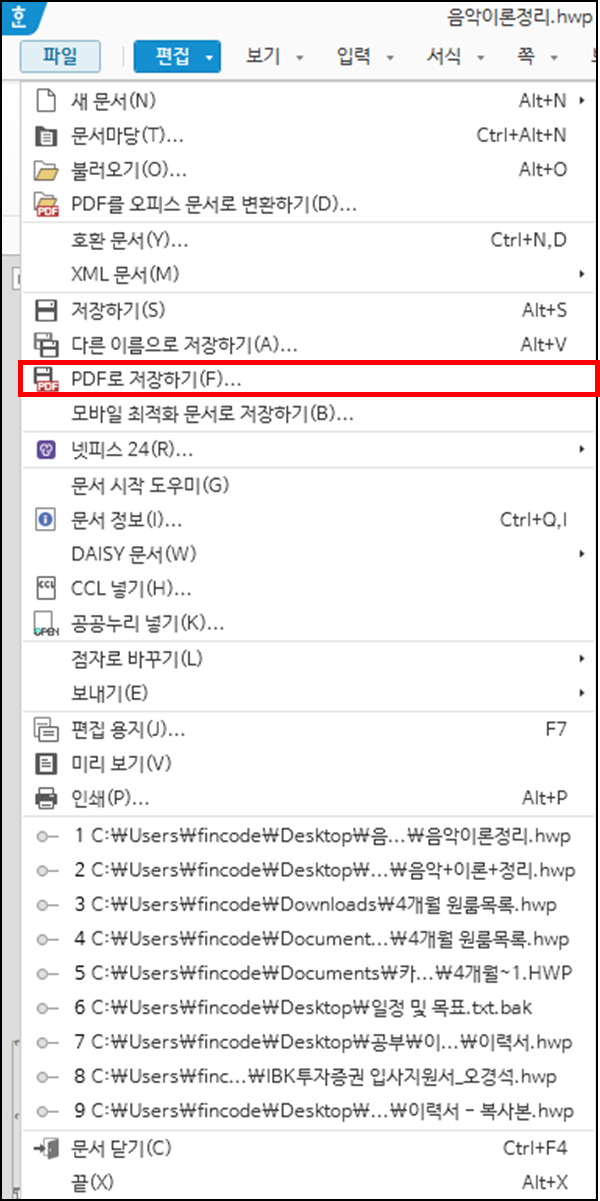 1. 한글파일 열고 파일 -> 'PDF로 저장하기(F)...'