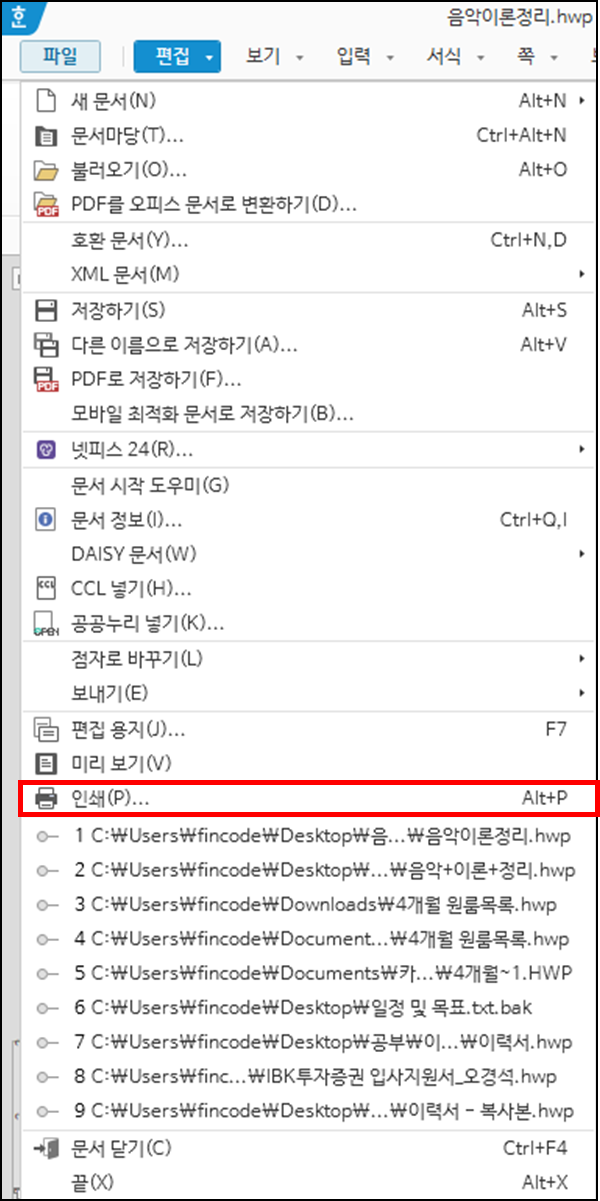1. 한글파일 열고 파일 -> '인쇄(P)...'