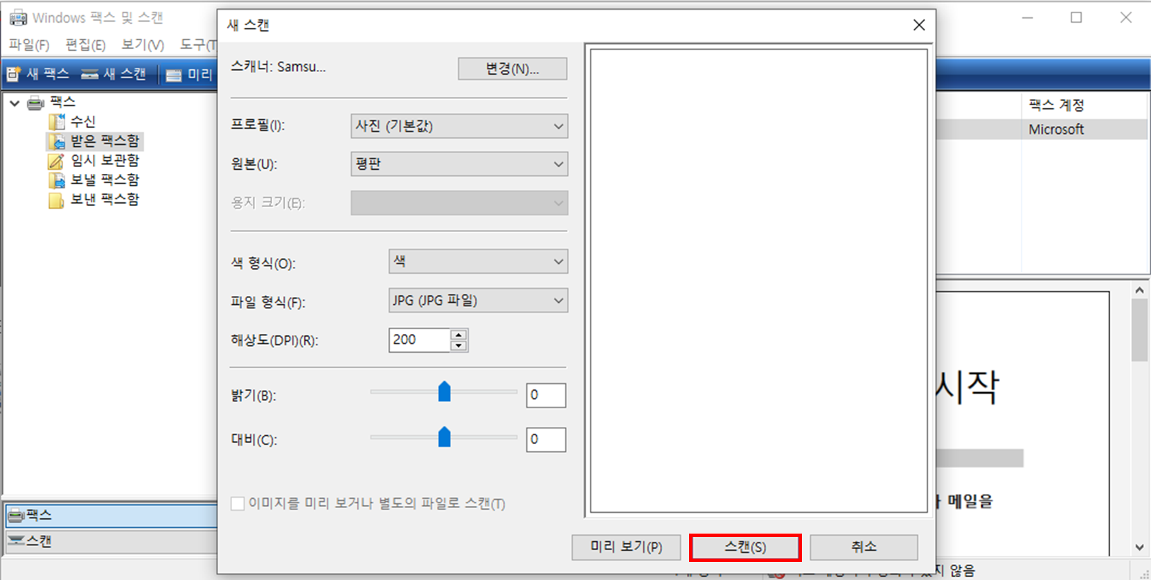 4. 각종 설정 확인 및 '스캔(S)'버튼 클릭