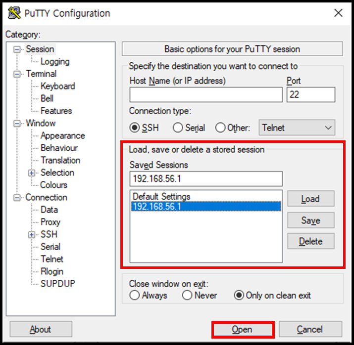 - Load, save or delete a stored session에서 Saved Sessions에 자주 접속하는 IP 저장 및 불러오기 가능