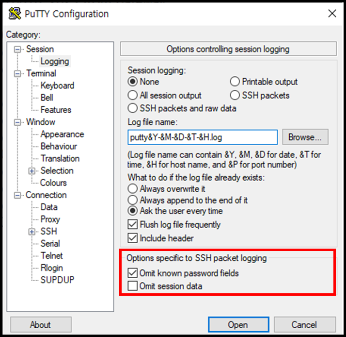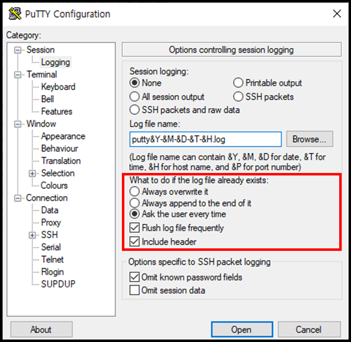Flush log file frequently : PuTTY는 데이터가 표시되는 즉시 데이터를 플러시하므로 세션이 열려있는 동안 로그 파일을 보면 항상 최신 상태. 클라이언트 시스템이 충돌하면 데이터가 보존될 가능성이 더 커짐. PuTTY가 느리게 실행되는 경우 이 옵션을 선택 취소할 수 있음