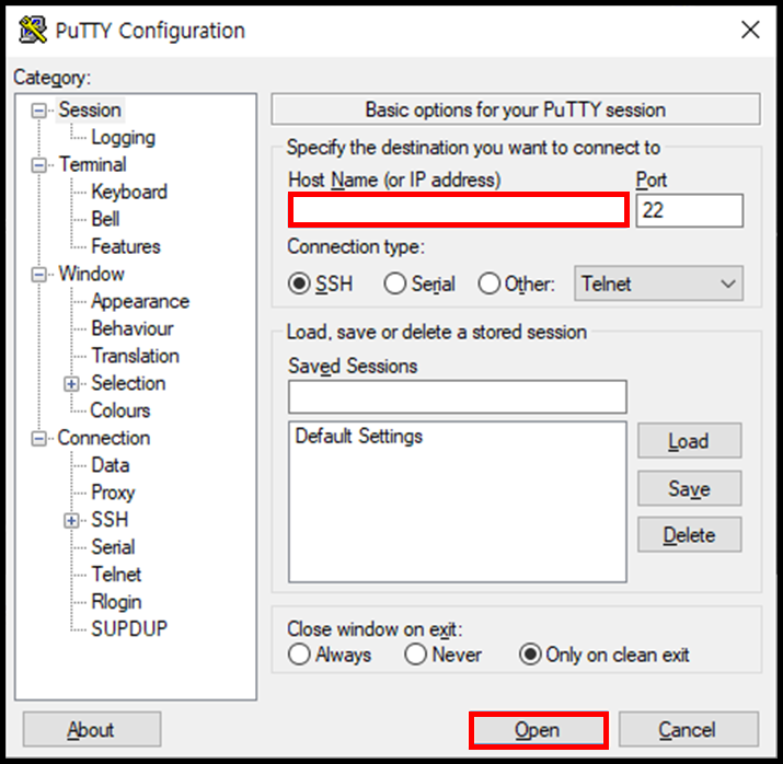 1. PuTTY 프로그램을 연 후 Session 정보 입력