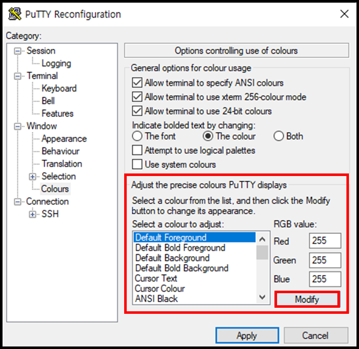 2. 우측 Adjust the precise colours PuTTY displays에서 'Default Foreground' 선택 후 우측 하단 'Modify'버튼 클릭