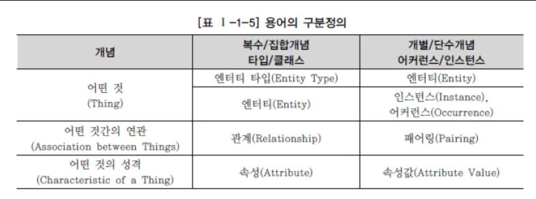 본 가이드에서는 현장 통용성을 반영하여 국내외적으로 가장 범용적으로 명명되고 있는 용어인 엔터티를 집합의 개념으로 지칭하고, 인스턴스를 단수의 개념으로 명명하도록 한다.