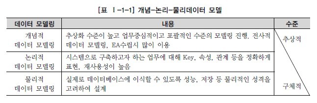 데이터 모델링은 추상화 수준에 따라 개념적 데이터 모델, 논리적 데이터 모델, 물리적 데이터 모델로 정리할 수 있다.