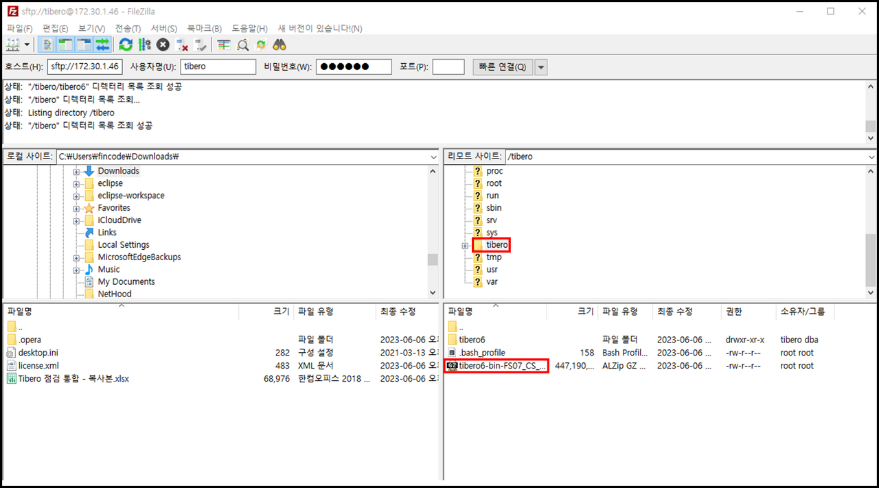 3. FileZilla를 이용해 최상위 디렉터리에 tibero 폴더를 생성 후 설치파일 넣기