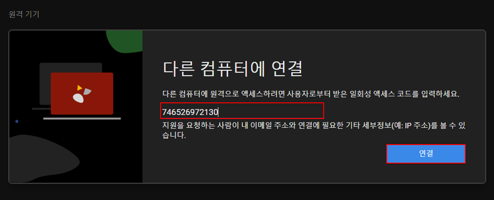 4. 생성 된 코드를 원격 접속하는 PC(이 기기)에서 입력 후 '연결' 버튼 클릭