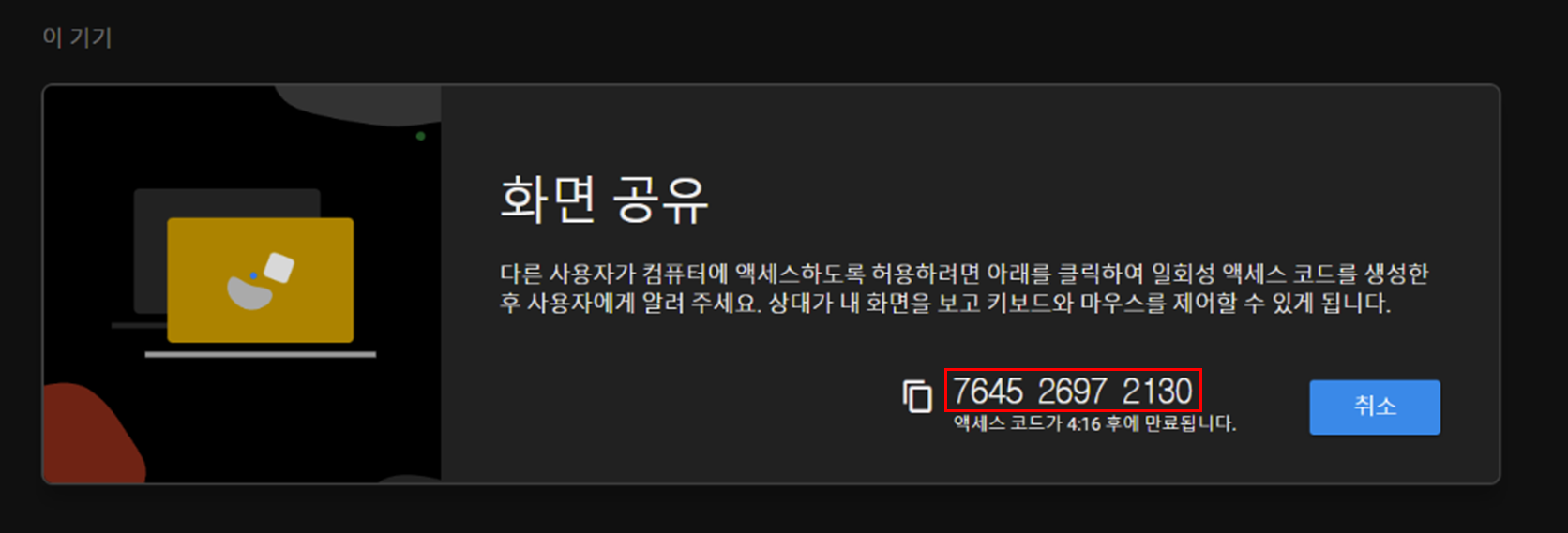 3. 접속 받는 PC(원격 기기)에서 생성 된 코드 확인