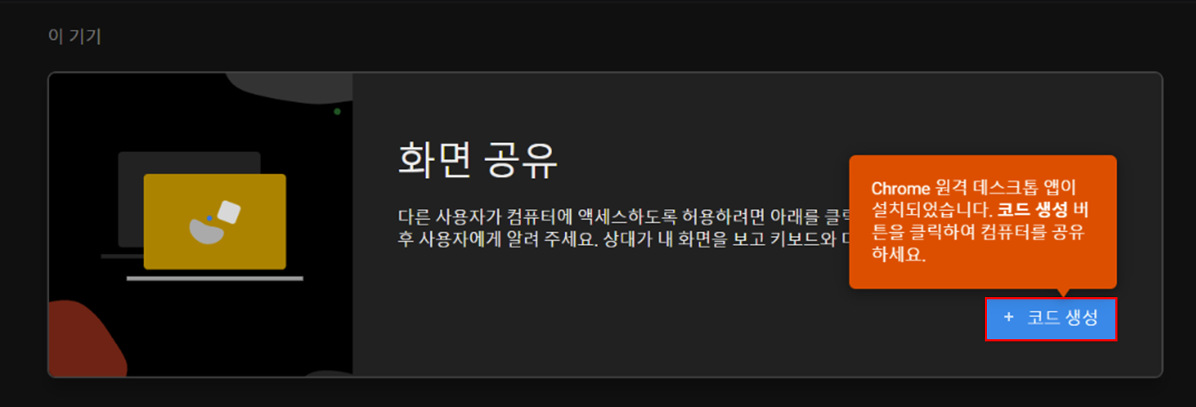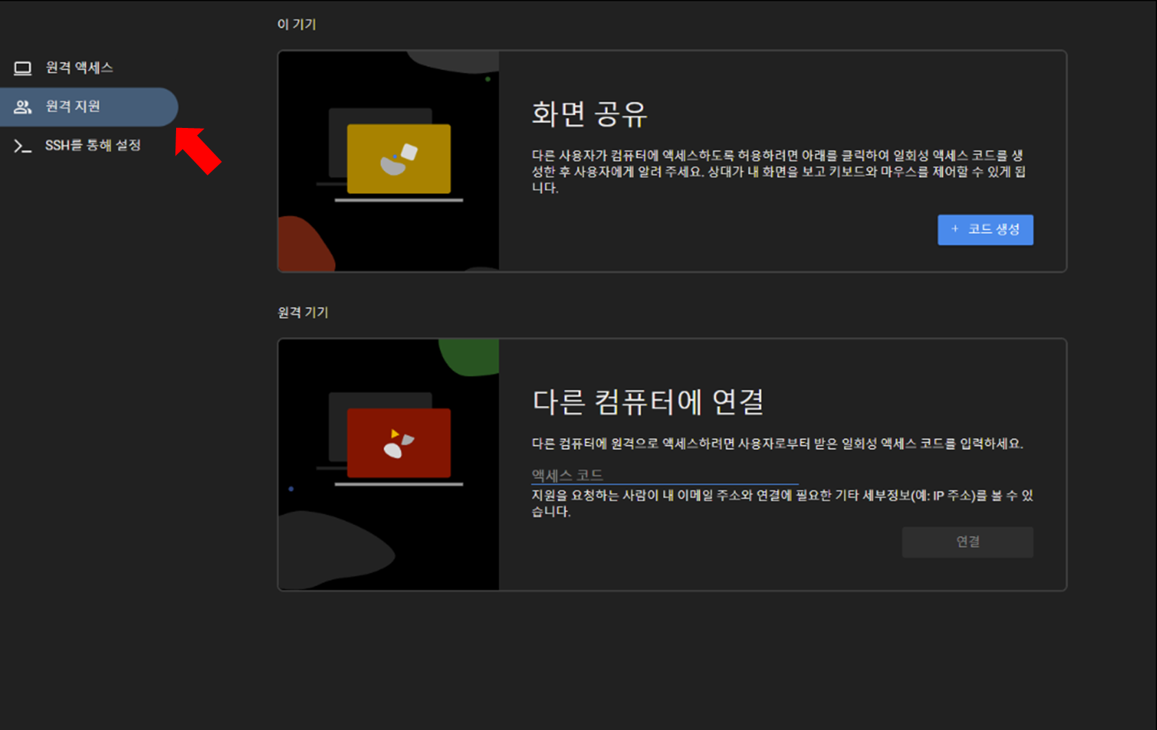 1. 원격 접속하는 PC(이 기기), 접속 받는 PC(원격 기기) 둘 다 크롬 원격 데스크톱에서 좌측 '원격 지원' 탭으로 접속