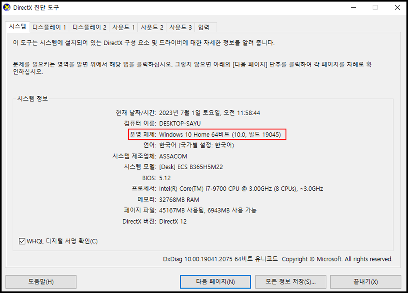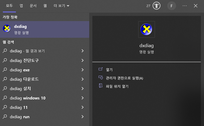 - 윈도우키 누르고 'dxdiag' 입력