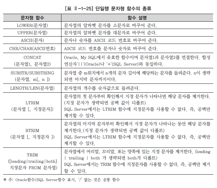 - 문자형 함수는 문자 데이터를 매개 변수로 받아들여서 문자나 숫자 값의 결과를 돌려주는 함수이다. 몇몇 문자형 함수의 경우는 결과를 숫자로 리턴하는 함수도 있다.