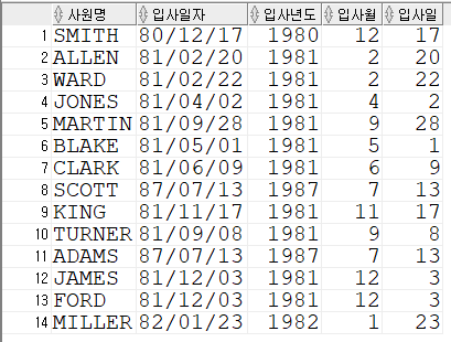 [예제] 사원(EMP) 테이블의 입사일자에서 년, 월, 일 데이터를 각각 출력한다. 아래 2개의 SQL 문장은 같은 기능을 하는 SQL 문장이다.