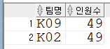 [예제] K-리그의 선수들 중 삼성블루윙즈(K02)와 FC서울(K09)의 인원수는 얼마인가.