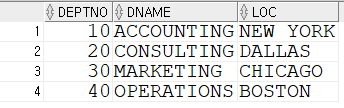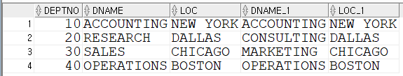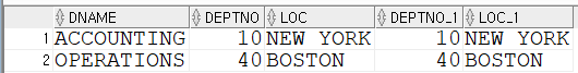 위 SQL의 경우 DNAME의 내용이 바뀐 부서번호 20, 30의 경우는 결과에서 제외된 것을 알 수 있다. 그리고 USING에 사용된 DEPTNO, DNAME이 첫 번째, 두 번째 칼럼으로 출력된 것과 함께, JOIN 조건에 참여하지 않은 LOC가 2개의 칼럼으로 표시된 것을 알 수 있다