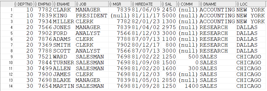 [예제] 아래 '*' 와일드카드처럼 별도의 칼럼 순서를 지정하지 않으면 NATURAL JOIN의 기준이 되는 칼럼 들이 다른 칼럼보다 먼저 출력된다. (ex: DEPTNO가 첫 번째 칼럼이 된다.) 이때 NATURAL JOIN은 JOIN에 사용된 같은 이름의 칼럼을 하나로 처리한다.