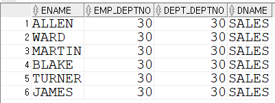 위 SQL의 경우 DNAME의 내용이 바뀐 부서번호 20, 30의 경우는 결과에서 제외된 것을 알 수 있다. 그리고 USING에 사용된 DNAME이 첫 번째 칼럼으로 출력된 것과 함께, JOIN 조건에 참여하지 않은 DEPTNO와 LOC가 2개의 칼럼으로 표시된 것을 알 수 있다.