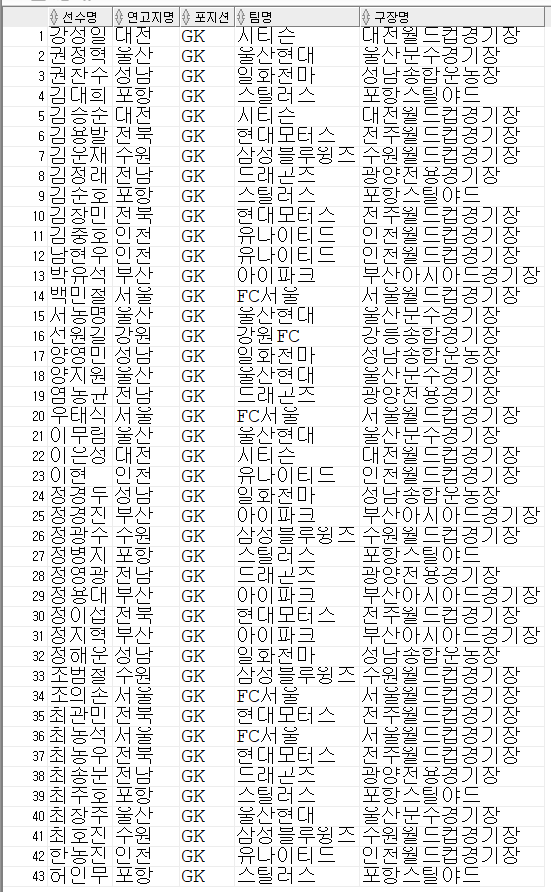 [예제] 포지션이 ‘GK’인 선수들에 대한 데이터만을 'BACK_NO'순으로 출력하는 SQL문을 만들어 본다.
