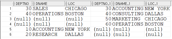 USING에 사용된 LOC, DEPTNO가 첫 번째, 두 번째 칼럼으로 출력되고, JOIN 조건에 참여하지 않은 DNAME 칼럼은 2개의 칼럼으로 표시된 것을 알 수 있다.
