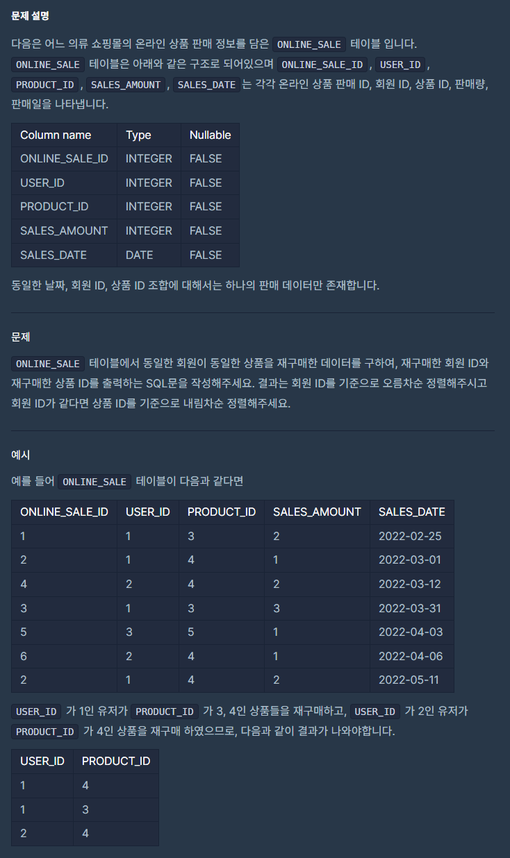 SQL_코딩테스트(재구매가 일어난 상품과 회원 리스트 구하기) 본문