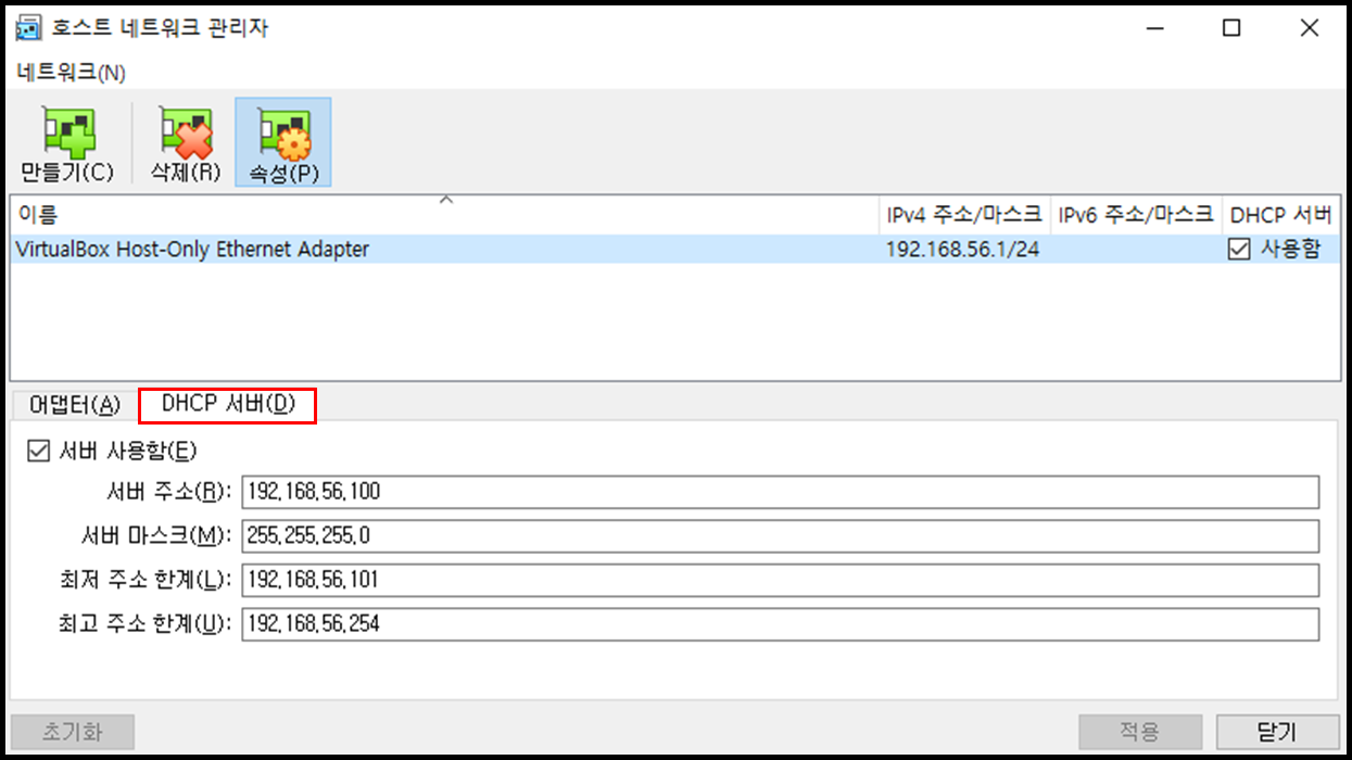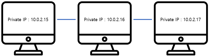 이때 호스트 전용 어댑터 모드를 사용한다면 VirtualBox는 DHCP 서버를 제공해서 각각의 서버마다 다른 IP를 할당해주기때문에 각각의 서버가 서로 접근이 가능하다.