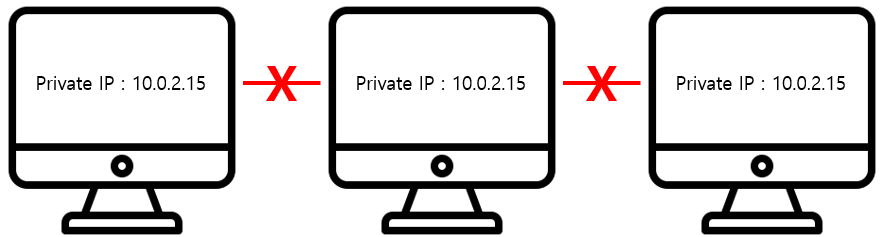 가상머신에서 서버를 여러 대 생산할 때, 각각의 서버는 별도의 설정이 없다면(NAT 모드) 동일한 IP 주소(10.0.2.15)를 할당받는다. 이는 곧, Host의 네트워크 연결상태 = Guest의 네트워크 연결상태를 의미한다. 그리고 Host의 외부에서 Guest에 접근하는 것이 포트포워딩 등의 방법을 제외한 일반적인 방법으로는 불가능하다. 또한 동일한 IP 주소를 가진 한, 각각의 서버는 서로 접근이 불가하다.