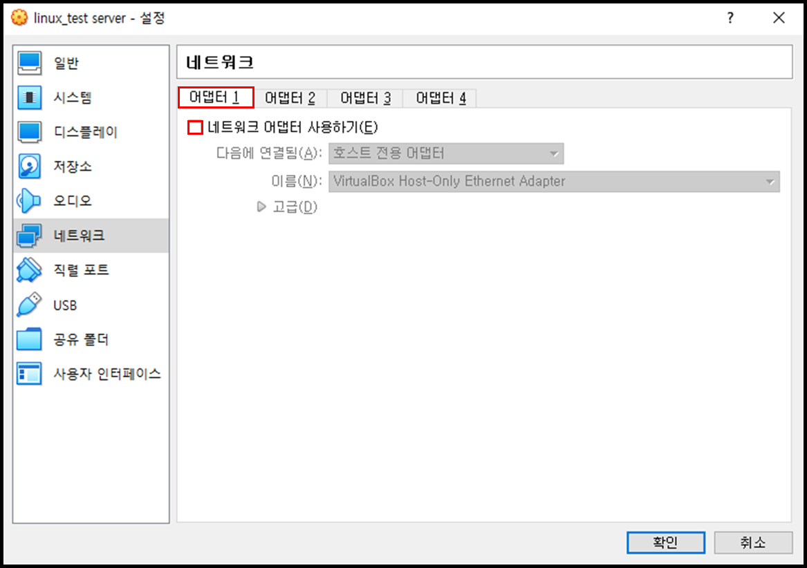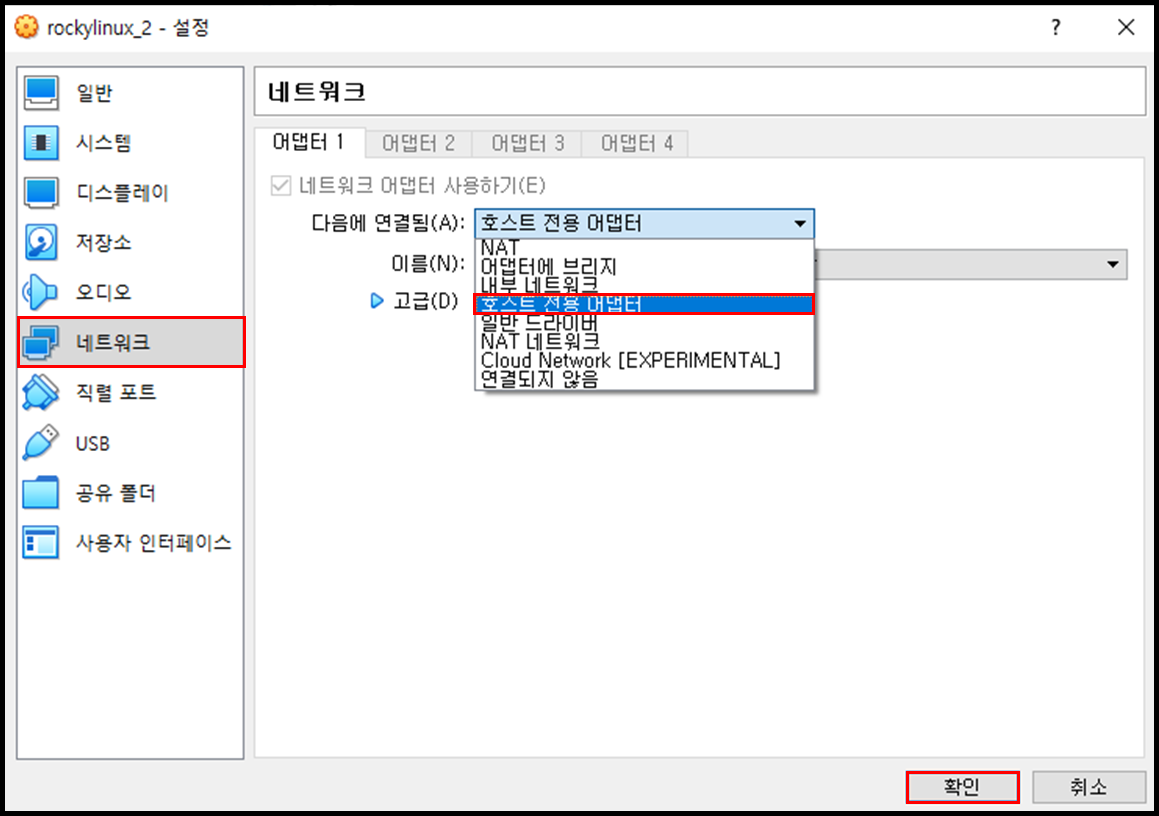 2. 설정 > 네트워크 > 다음에 연결됨(A): 호스트 전용 어댑터 > 확인