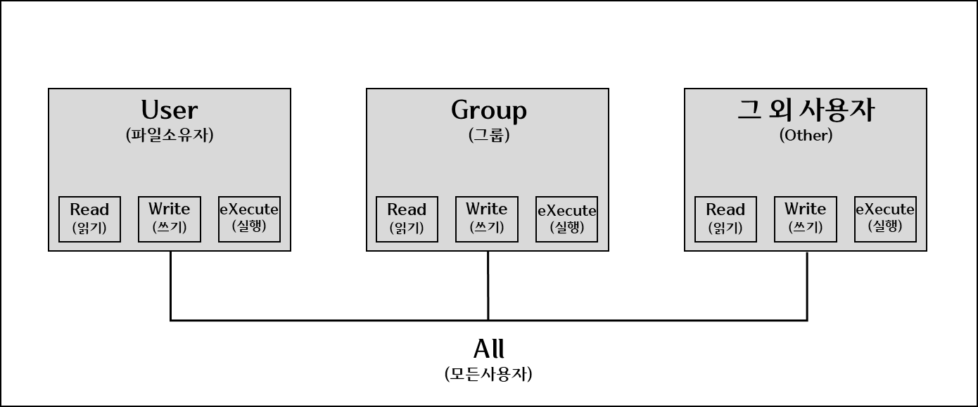 | x | 실행(excute) | 파일을 실행하거나 디렉터리 트리로 되돌아가기 |