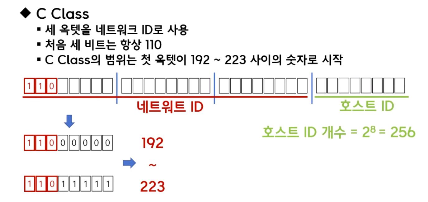 - 네트워크 주소 범위는 192.0.0.X ~ 223.255.255.X 까지이고 호스트 주소는 X.X.X.0 ~ X.X.X.255