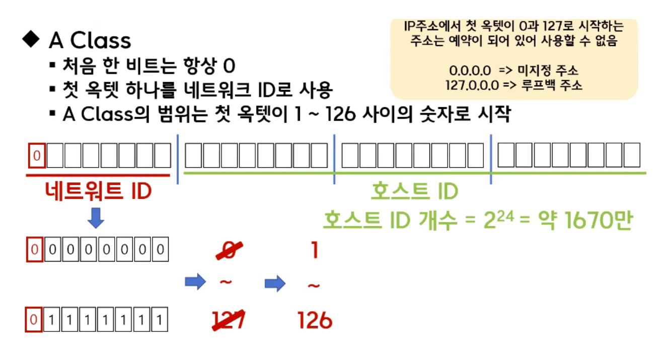 - 네트워크 주소 범위는 0.X.X.X ~ 127.X.X.X 까지이고 호스트 주소는 X.0.0.0 ~ X.255.255.255