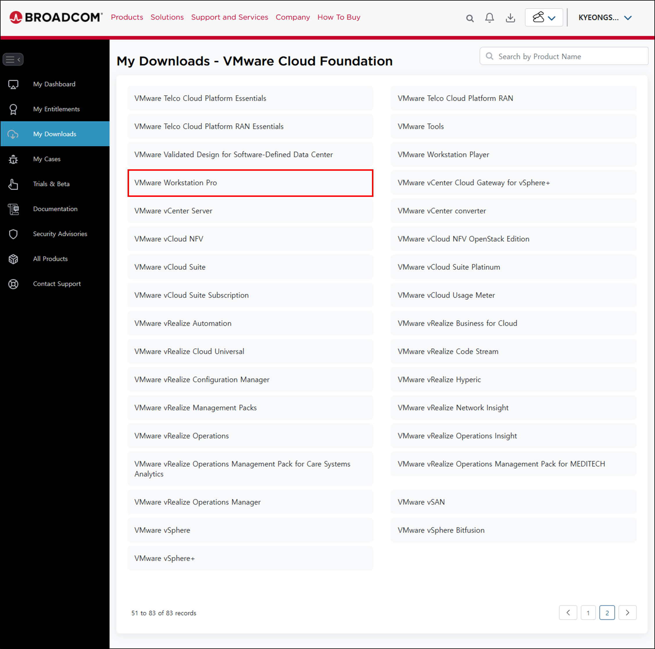 3. 좌측 상단 Software > VMware Cloud Foundation > My Downloads > VMware Workstation Pro 클릭