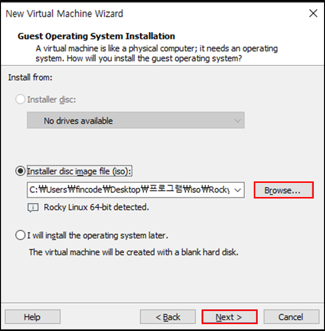 4. 'Install disc image file (iso):' 체크박스 클릭 > 'Browse...' 버튼 클릭 > iso 클릭 > 'Next >' 버튼 클릭ㅋ