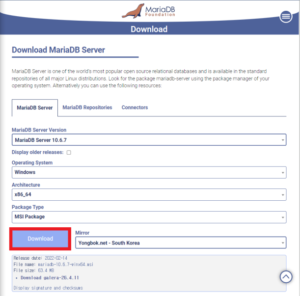2. MariaDB에서 원하는 버전으로 'Download' 버튼을 클릭