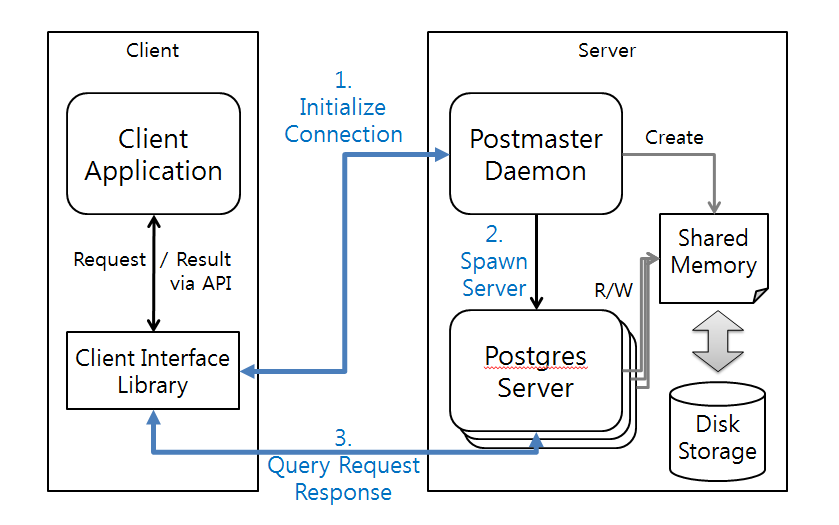 클라이언트는 인터페이스 라이브러리(libpg, JDBC, ODBC 등의 다양한 인터페이스)를 통해 서버와의 연결을 요청(1)하면, Postmaster 프로세스가 서버와의 연결을 중계(2)한다. 이후 클라이언트는 할당된 서버와의 연결을 통해 질의를 수행(3)한다. 서버 내부의 질의 수행 과정을 간단히 살펴보면 다음과 같다.