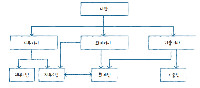 - 계층형 DBMS(Hierarchical DBMS)는 처음으로 등장한 DBMS 개념으로 1960년대에 시작되었다. 아래 그림과 같이 각 계층은 트리 형태를 갖는다. 사장 1명에 이사 3명이 연결되어 있는 구조. 계층형 DBMS의 문제는 처음 구성을 완료한 후에 이를 변경하기가 상당히 까다롭다. 또한 다른 구성원을 찾아가는 것이 비효율적이다. 예를 들어 재무2팀에서 회계팀으로 연결하려면 재무이사 -> 사장 -> 회계이사 -> 회계팀과 같이 여러 단계를 거쳐야한다. 지금은 사용하지 않는 형태.