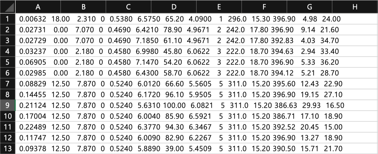 column_names = ['CRIM', 'ZN', 'INDUS', 'CHAS', 'NOX', 'RM', 'AGE', 'DIS', 'RAD', 'TAX', 'PTRATIO', 'B', 'LSTAT', 'MEDV']