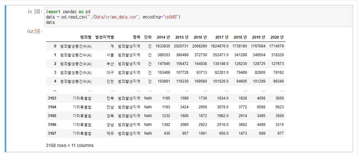 마지막으로 파이썬은 한글 파일을 불러올 때 글자가 깨져서 에러가 나온다. 그 경우에는 파일을 불러오는 문장을 적은 뒤 encoding="cp949"를 적으면 된다. 그런 다음 crime_data를 출력하면 다음과 같은 결과가 출력된다.