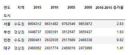 >>> Index(['지역', '2015', '2010', '2005', '2000', '2010-2015 증가율'], dtype='object')