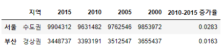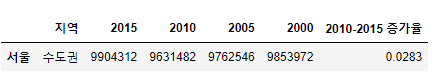columns = ['지역', '2015', '2010', '2005', '2000', '2010-2015 증가율']