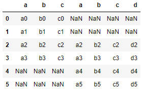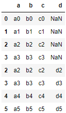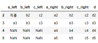 위와같이 left 옵션은 좌측의 DataFrame(df1)을 기준으로 합친다. KEY인 b열에서 데이터가 df1의 KEY값들만 전부 출력된 걸 볼 수 있을 것이다. 참고로 KEY를 지정해주지 않으면 다음과 같이 좌측의 DataFrame(df1)이 전부 출력되고 df2는 매칭이 되는 값만 출력되고 나머지는 NaN값이 출력된다.