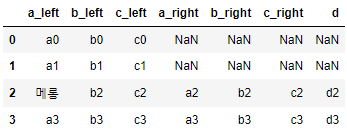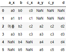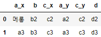 참고로 x는 , 좌측의 DataFrame 열이고 y는 우측의 DataFrame 열이다. 필자의 출력 값을 보면 중간에 '메롱' 단어가 있는데 이는 df1의 a컬럼의 값을 하나 변경한 것으로 같은 열이 두 개로 쪼개졌기 때문에 공통된 DataFrame의 열에서 하나의 데이터 값이 바뀌어도 행 전체가 삭제가 되지 않고 그대로 출력된 모습을 보여주기 위해 변경했다.