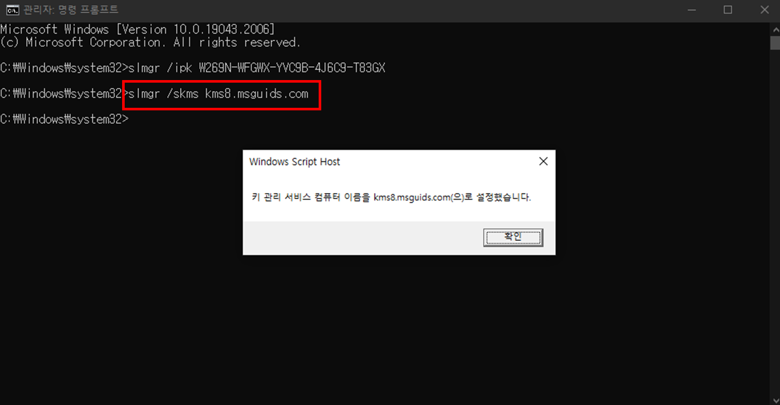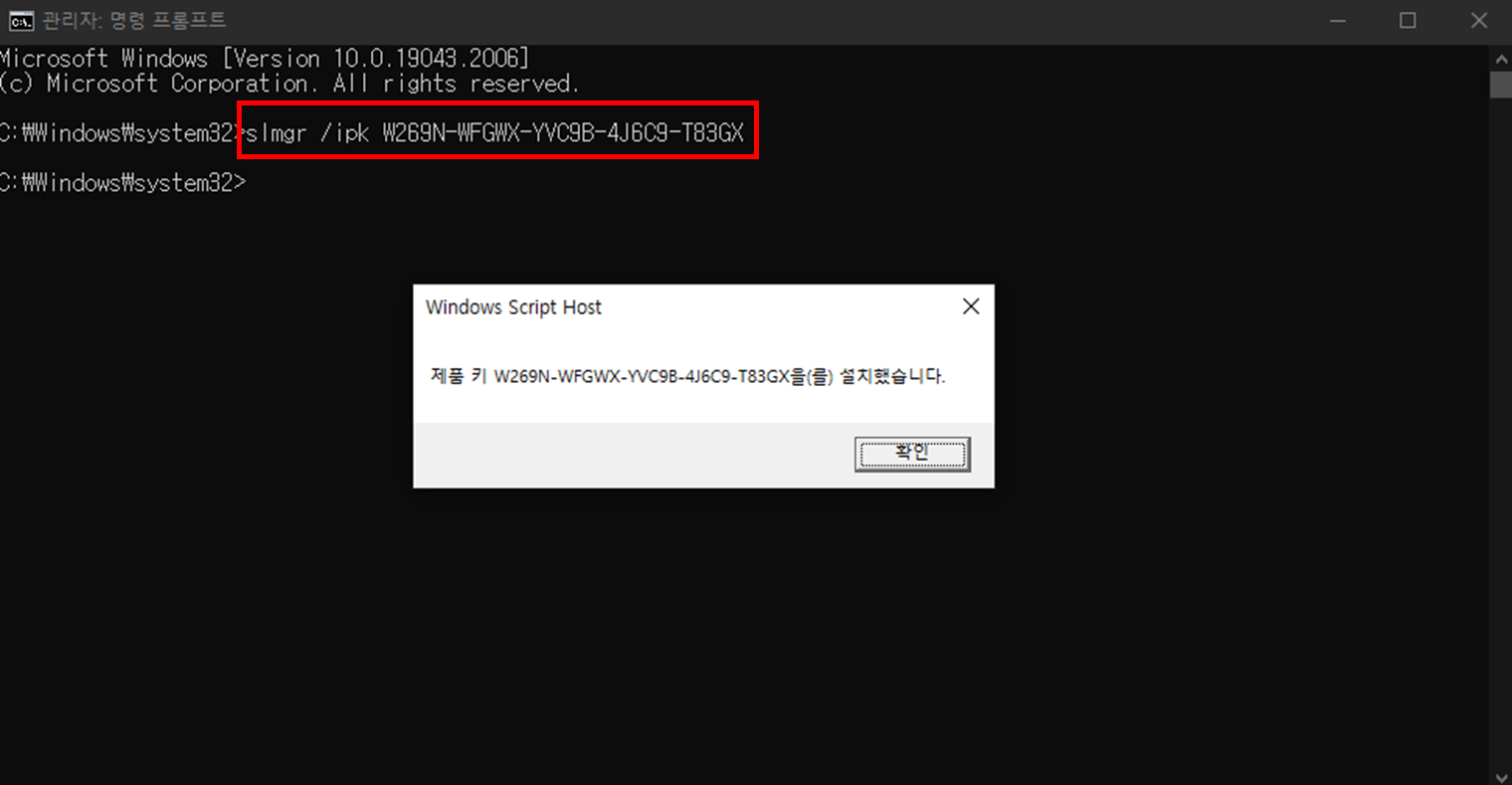4. slmgr /ipk W269N-WFGWX-YVC9B-4J6C9-T83GX 입력 후(해당 버전에 맞는 제품 키)