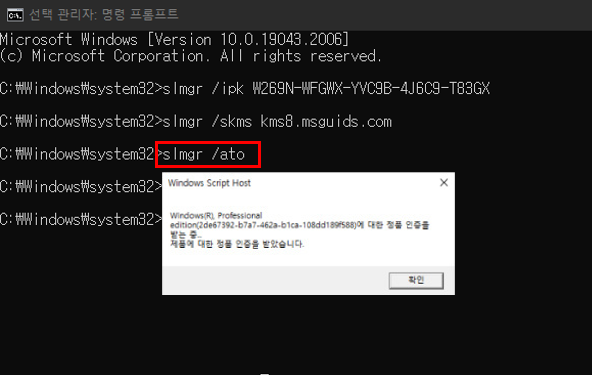 6. slmgr /ato를 입력하면 정품 인증 성공